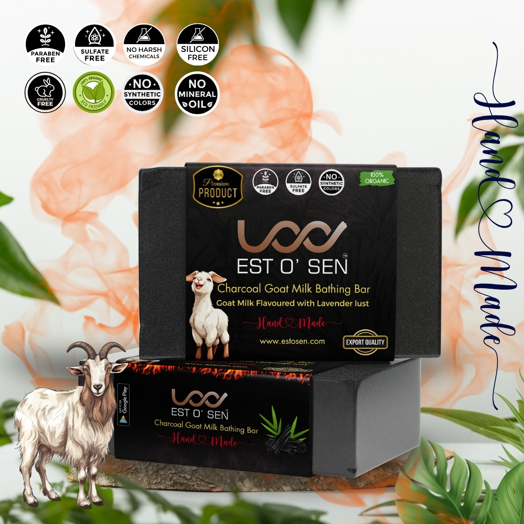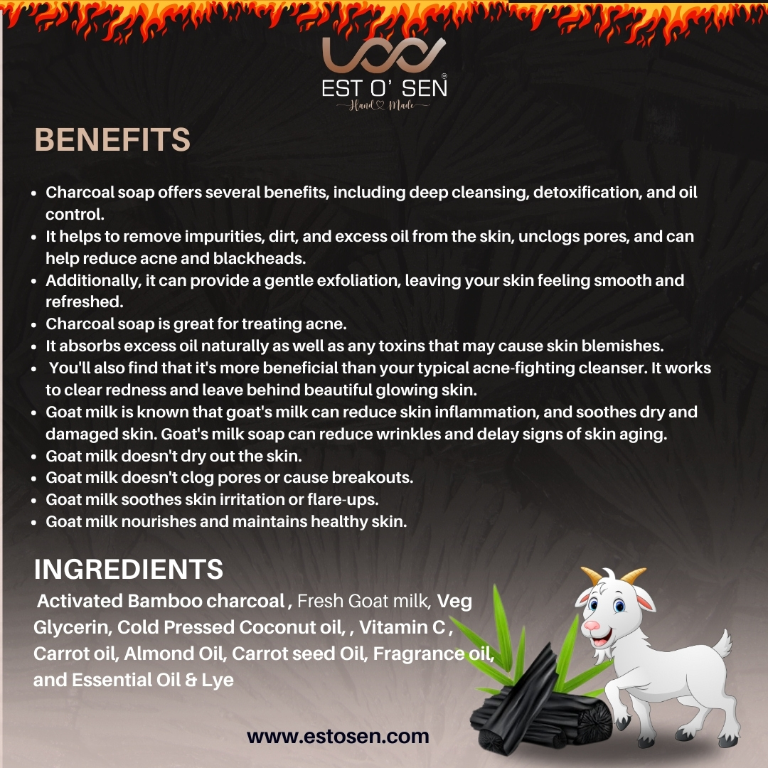 Estosen brings to you purely handmade Activated Charcoal soap infused with Goat Milk known for its magical effects on the skin. Charcoal soap helps to absorb excess oil, dirt, product buildup and harmful bacteria from your skin, all of which are leading causes of common breakouts. Charcoal also works as an anti-inflammatory, absorbing substances that inflame the skin so it can prevent redness and leave you with cleaner, clearer skin.