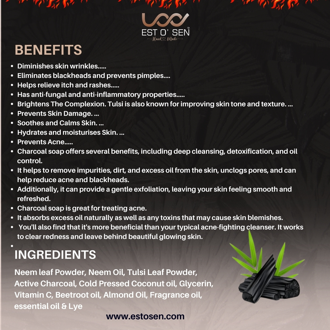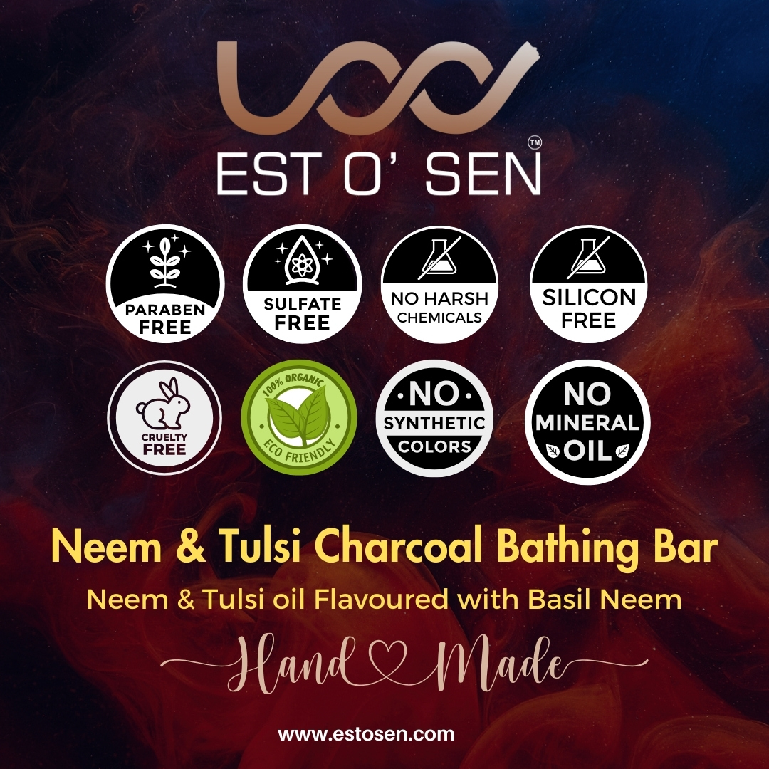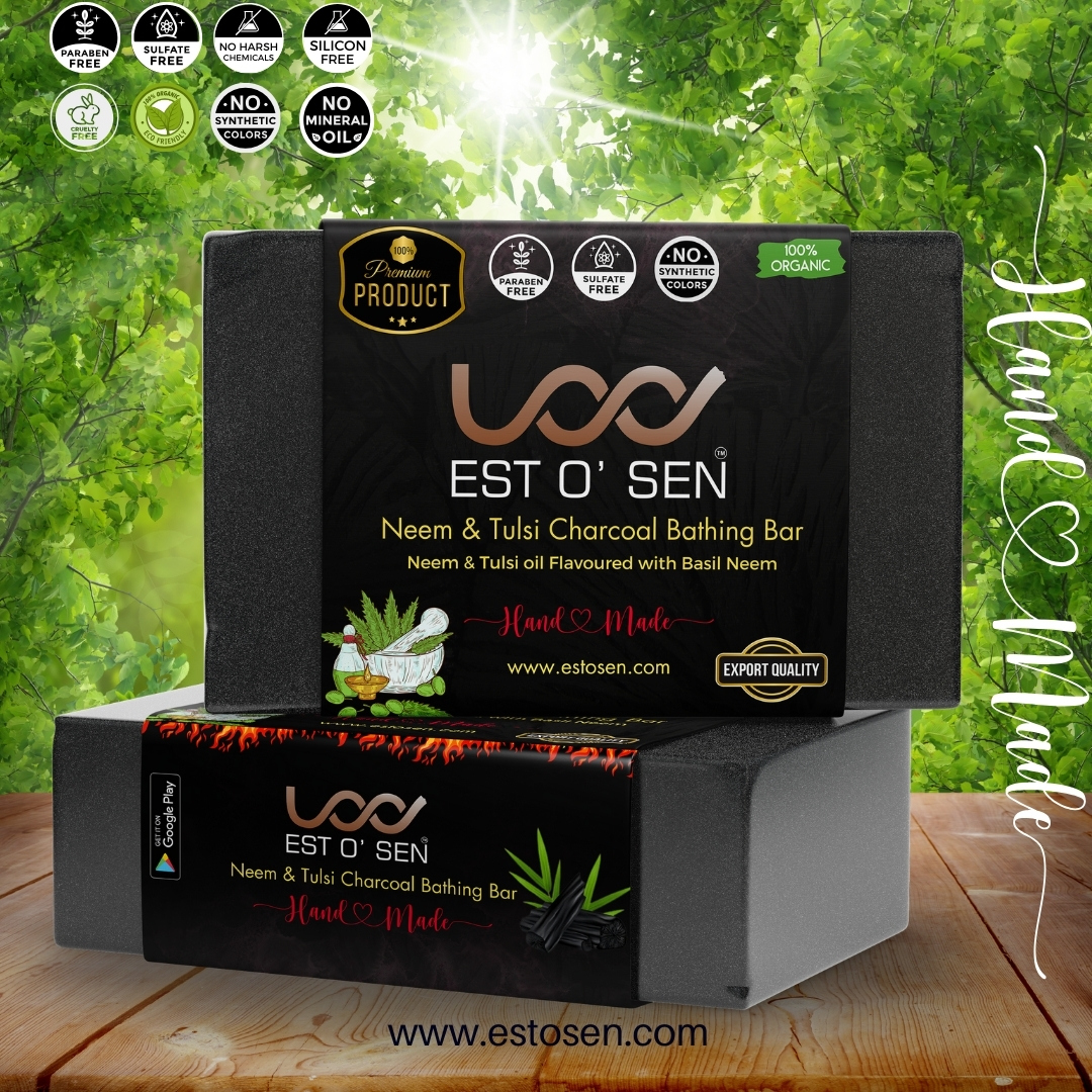 Estosen Charcoal Neem Tulsi Premium Hand-made Soap Indulge in the luxury of nature with our premium hand-made soap, crafted from the finest organic ingredients grown on our own farm. This luxurious soap blends the purifying power of Activated Charcoal, the healing properties of Neem, and the soothing benefits of Tulsi (Holy Basil) to provide your skin with a truly revitalizing experience.