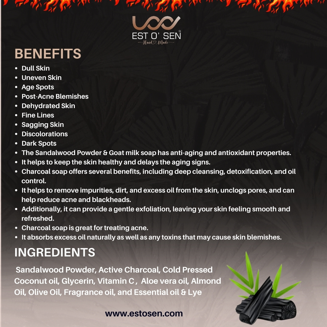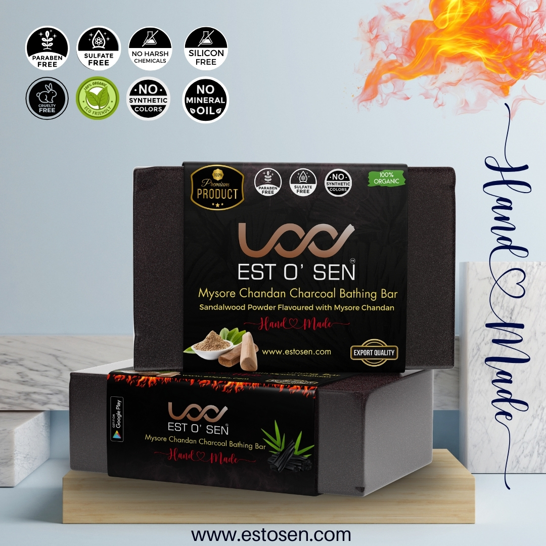 Estosen brings to you purely handmade Active Charcoal soap infused with Sandalwood Powder known for its magical effects on the skin. Sandalwood Powder hydrates the skin, and shields against oxidative stress-purifying properties. With the added benefits of Active Charcoa, it helps relieve stress and tension in the muscles.