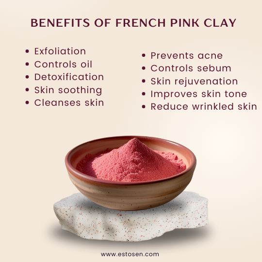 Estosen French pink clay is enriched with the goodness of several minerals that are helpful in getting a healthy and glowing skin. It is a great exfoliator, deeply cleanses and removes impurities from the skin. It also helps in reducing acne and pimples.