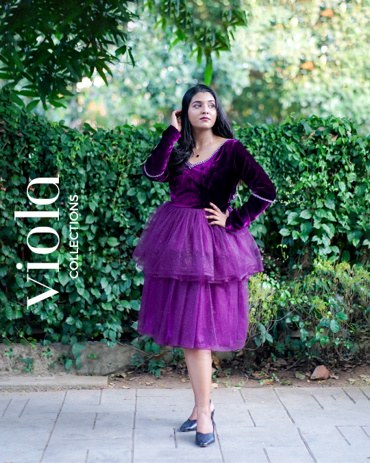 VIOLA Collections Designer Wear Fit and flare violet dress in velvet, modeled with full sleeves, and perfect for all special occasions.